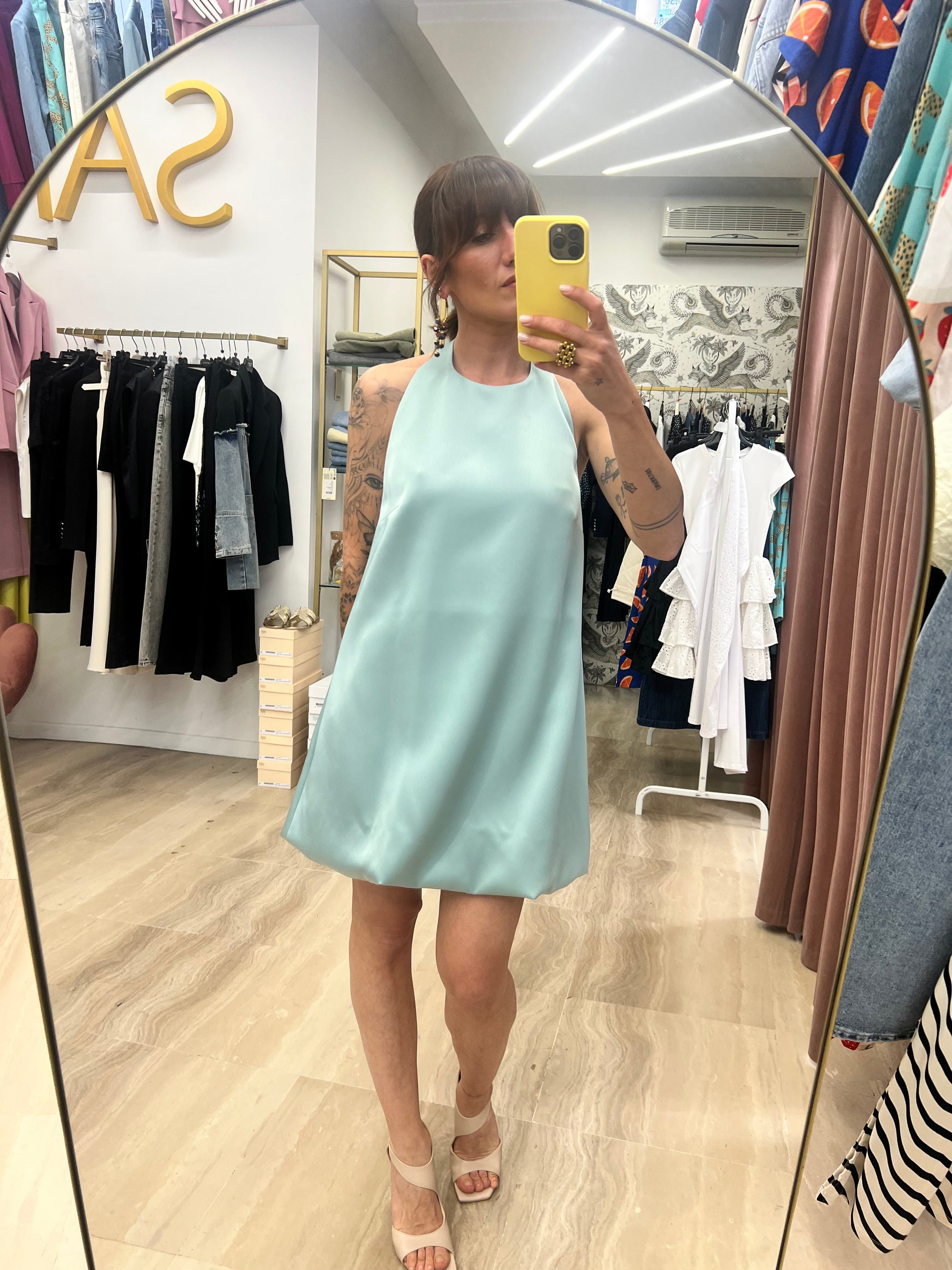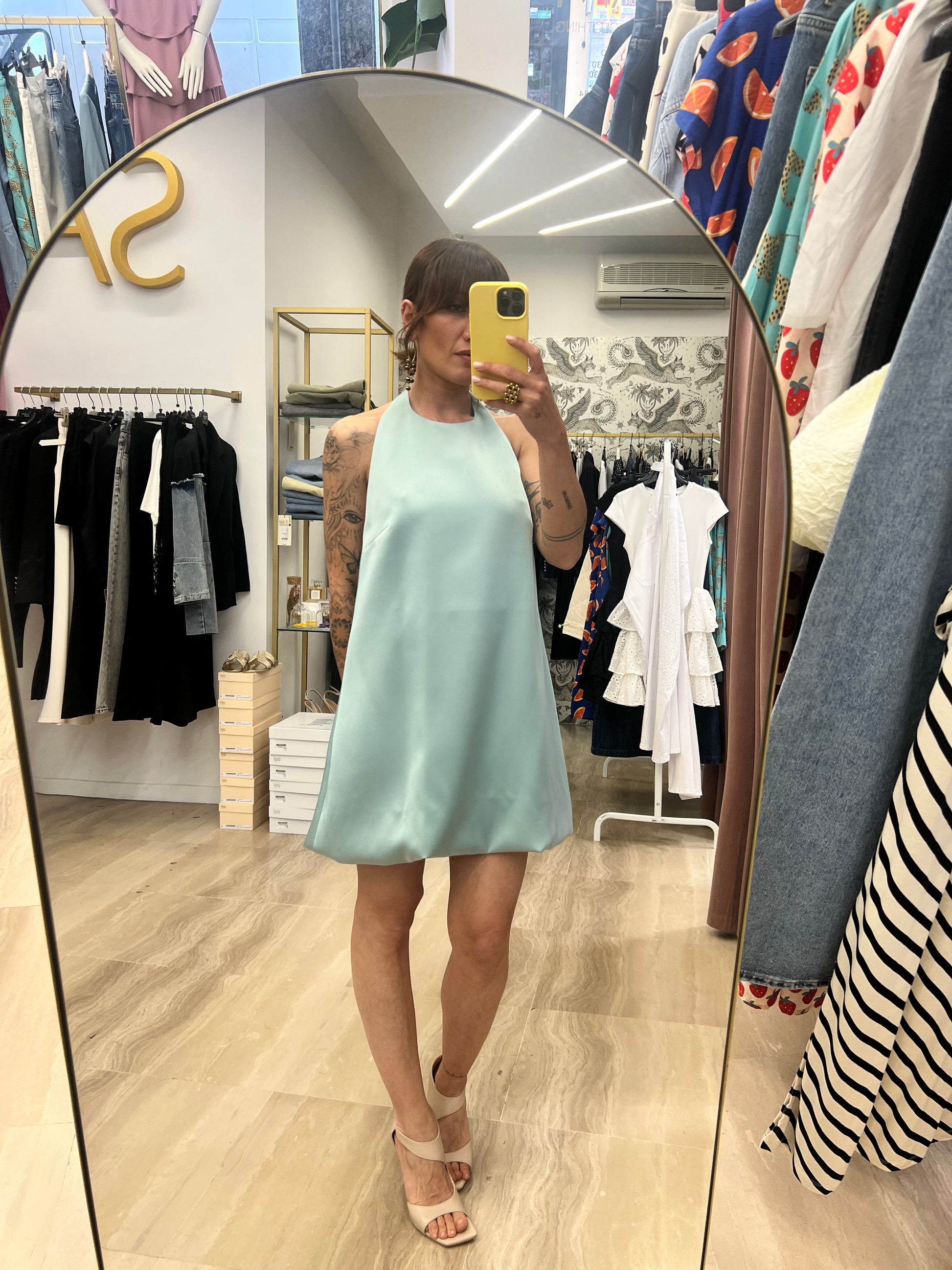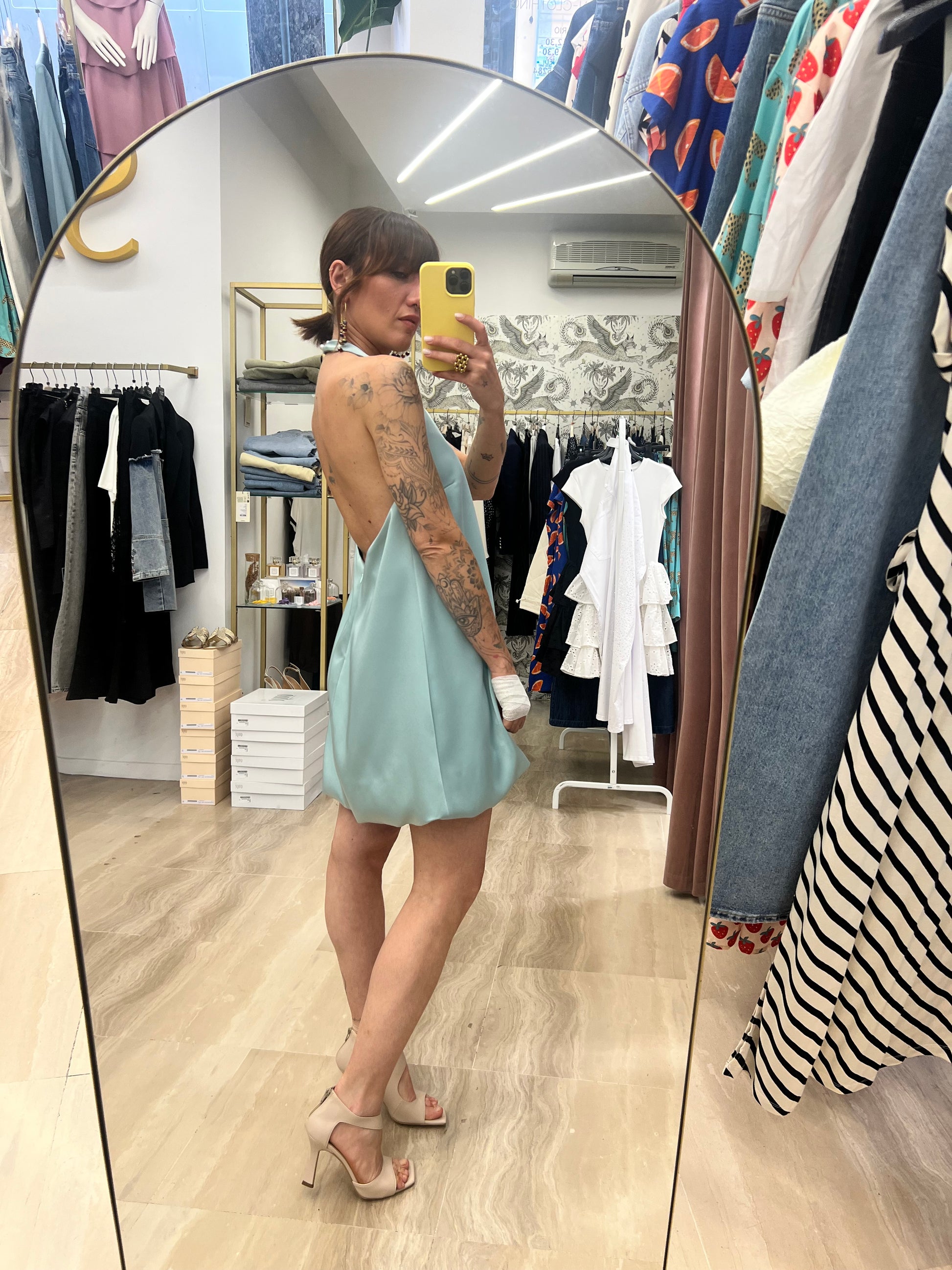 Abito corto con elastico sul fondo per rendere la vestibilità a palloncino. Ampio scollo sulla schiena.