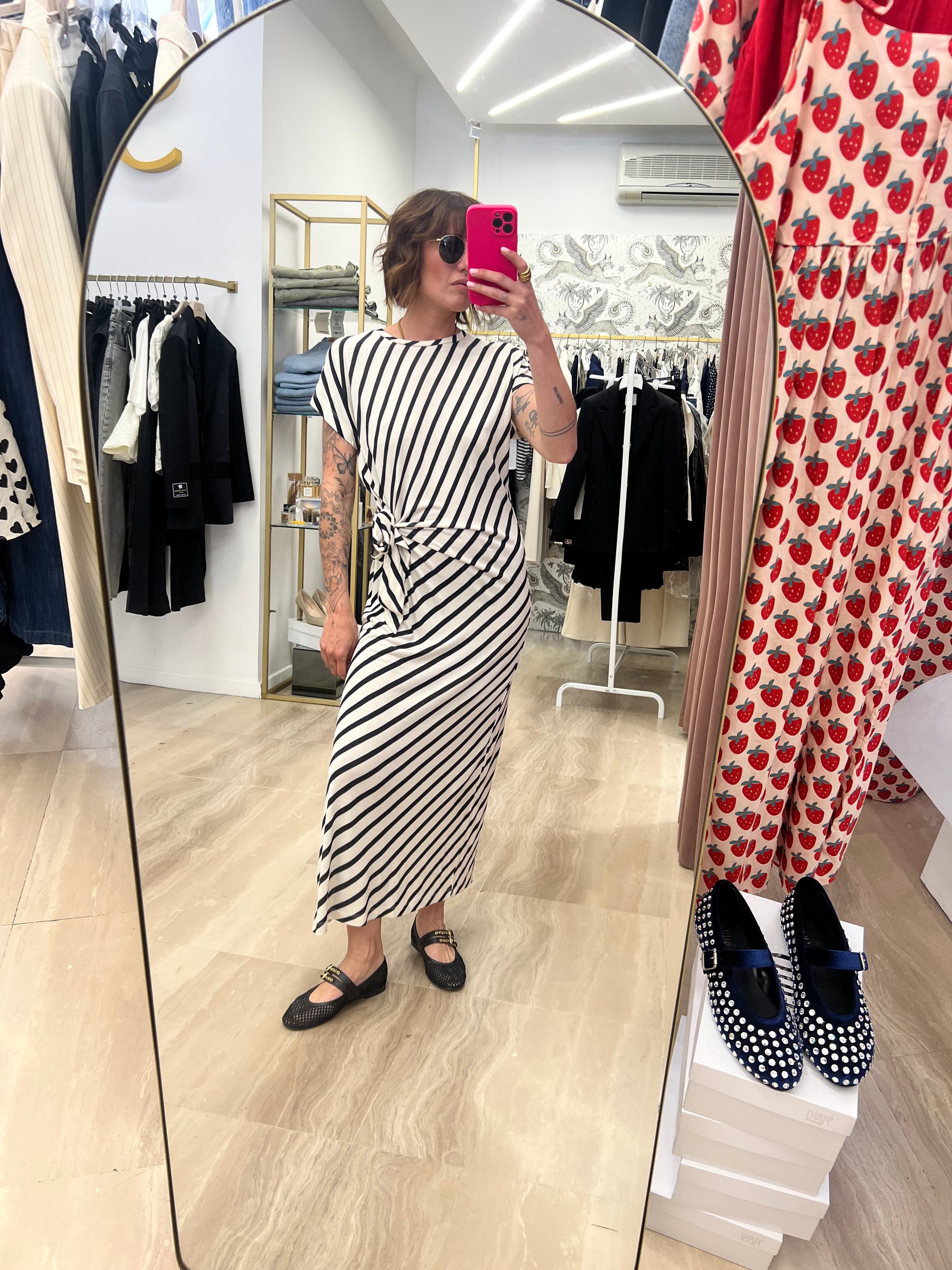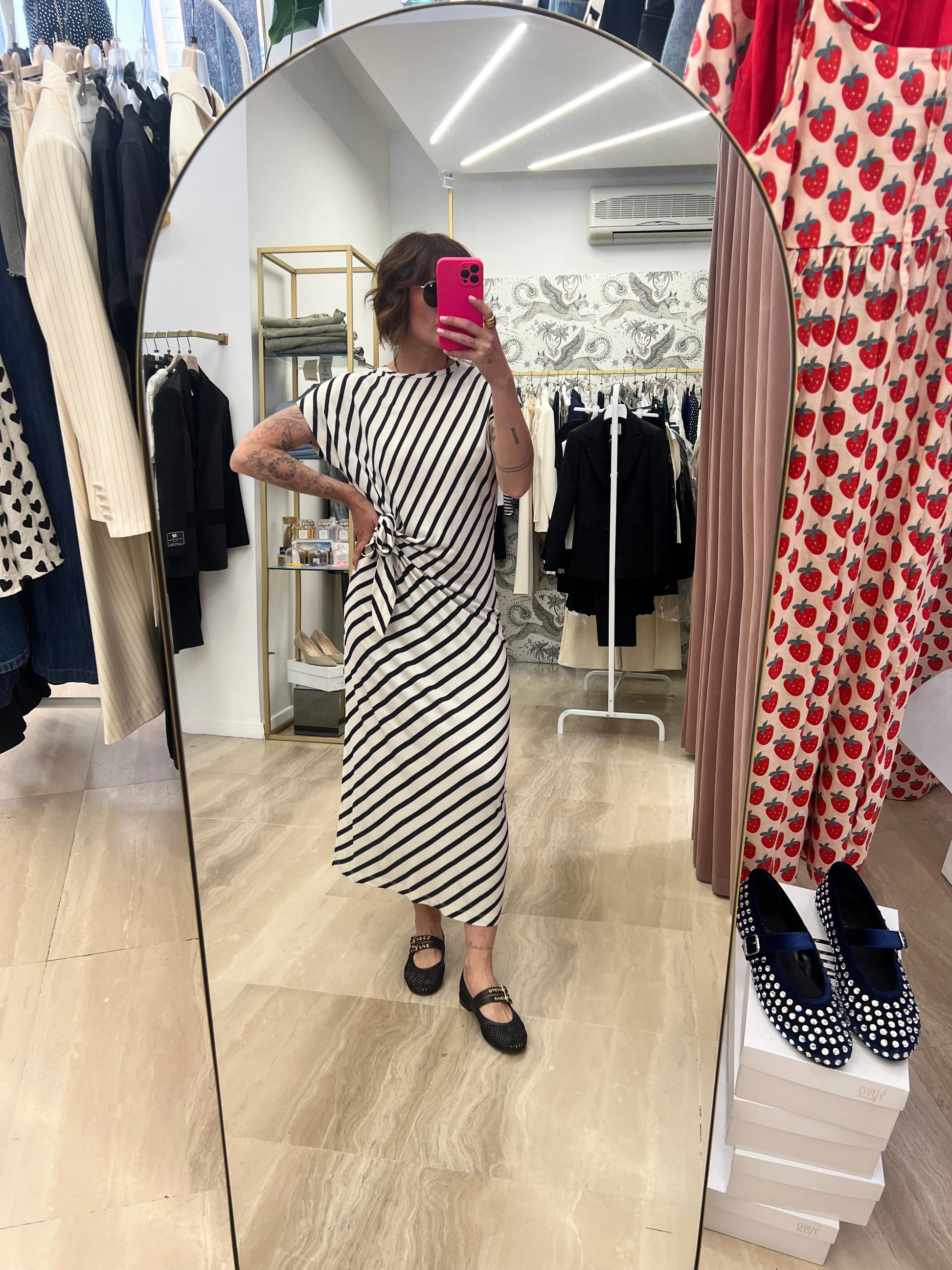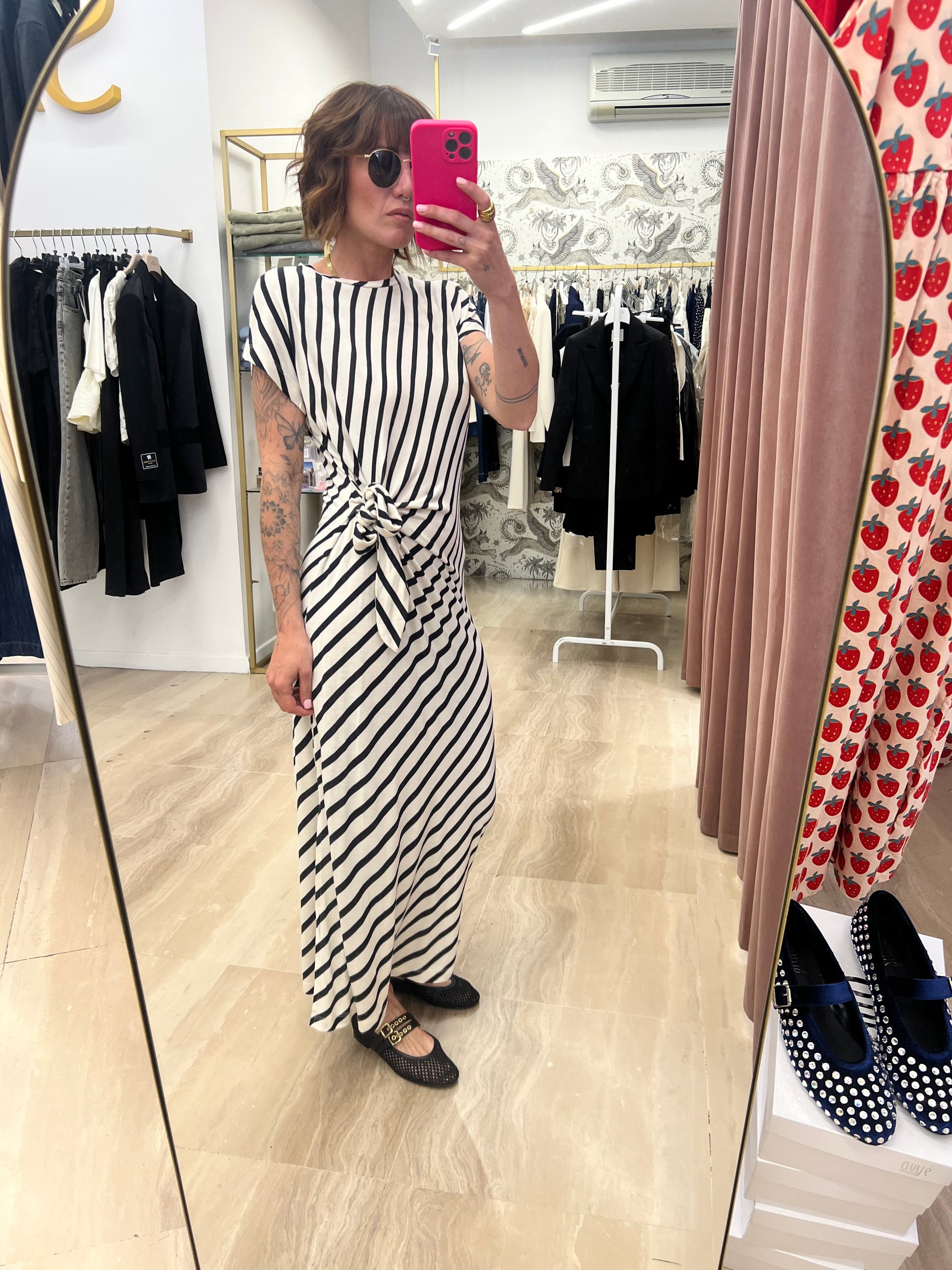 Abito elasticizzato a righe con nodo laterale regolabile.